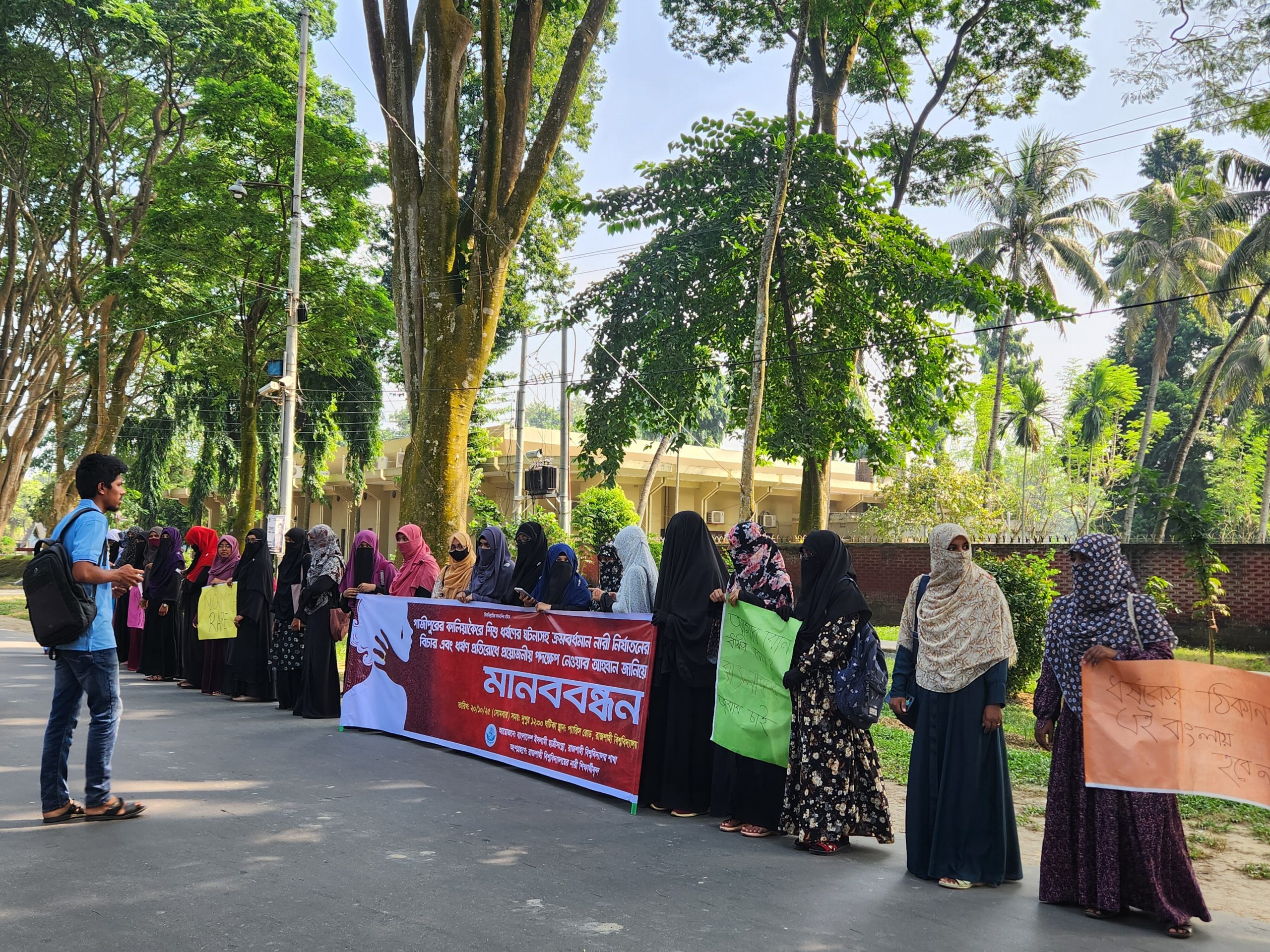 সোমবার (২০ অক্টোবর) দুপুর ১২টায় বিশ্ববিদ্যালয়ের প্যারিস রোডে এ মানববন্ধন করেন তারা। এসময় তাদের বিভিন্ন প্ল্যাকার্ড হাতে নিয়ে দাড়িয়ে থাকতে দেখা যায়৷ প্ল্যাকার্ডগুলোতে ‘আমার বোন ধর্ষিতা কেন? বাংলাদেশ জবাব চাই’, ধর্ষকের বিচার চাই’, ‘ধর্ষকের কোন ধর্মীয় পরিচয় নেই দর্শকের’, ধর্ষকের পরিচয় সে ধর্ষক, ‘ধর্ষকের ঠিকানা এই বাংলায় হবে না’, নো মোর র্যাপ ইত্যাদি স্লোগান লিখা ছিল।