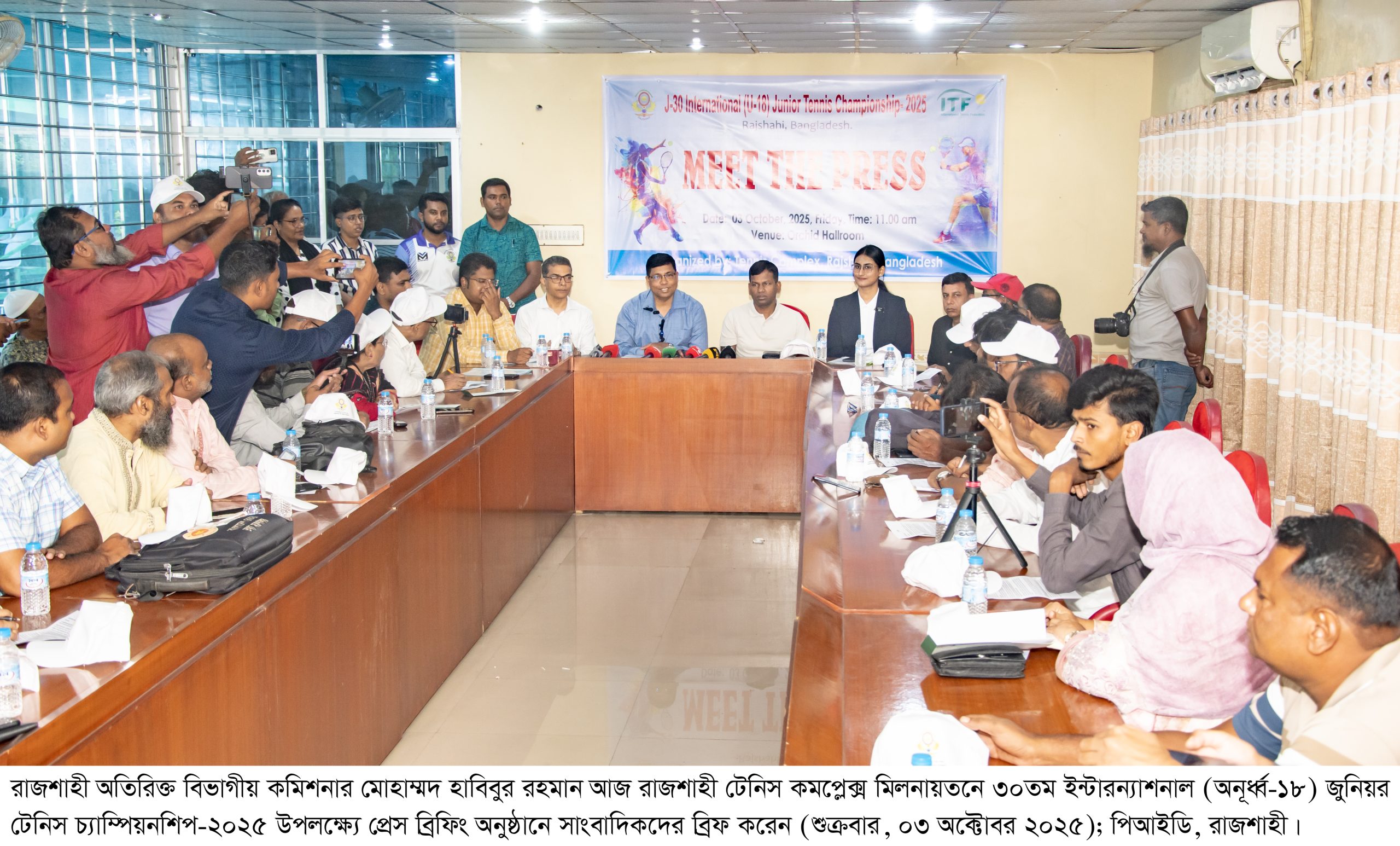 সাংবাদিকদের ব্রিফিংকালে অতিরিক্ত বিভাগীয় কমিশনার বলেন, আন্তর্জাতিক টেনিস ফেডারেশনের অনুমোদনে, যুব ও ক্রীড়া মন্ত্রণালয়ের আর্থিক অনুদানে, বাংলাদেশ টেনিস ফেডারেশনের সহায়তায় ও রাজশাহী টেনিস কমপ্লেক্সের ব্যবস্থাপনায় আগামী ০৪ থেকে ১০ অক্টোবর ২০২৫ তারিখ পর্যন্ত ৩০তম রাজশাহী ইন্টারন্যাশনাল (অনূর্ধ্ব-১৮) জুনিয়র টেনিস চ্যাম্পিয়নশিপ ২০২৫ অনুষ্ঠিত হবে। টুর্নামেন্টে স্বাগতিক বাংলাদেশসহ বিশ্বের ১১টি দেশের সর্বমোট ৫২ জন খেলোয়াড় এবং ১০ জন ম্যানেজার অংশগ্রহণ করবে।