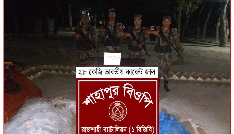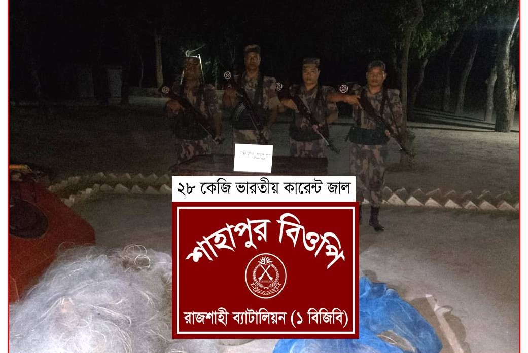 প্রেস বিজ্ঞপ্তি: শনিবার (১৮ অক্টোবর ২০২৫) আনুমানিক ১৮,৩০ টায় রাজশাহী ব্যাটালিয়ন (১ বিজিবি) অধীনস্থ শাহাপুর বিওপি’র দায়িত্বপূর্ণ এলাকায় বিজিবি’র নিয়মিত টহল দল কর্তৃক সীমান্ত পিলার ৬৮/২-এস হতে আনুমানিক ০৩ কিলোমিটার বাংলাদেশের অভ্যন্তরে রাজশাহী জেলার কাটাখালী থানাধীন সাহাপুর মধ্যপাড়া নামক এলাকায় পদ্মা নদীতে অভিযান পরিচালনা করে মালিকবিহীন ২৮ কেজি ভারতীয় কারেন্ট জাল আটক করতে সক্ষম হয়। জানা যায় আটককৃত কারেন্ট জালের সিজার মূল্য ৫৬,০০০/- টাকা।
